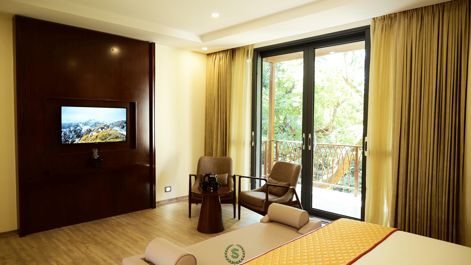 The Silver Ignots rooms offer an opulent experience in Chikkamagaluru with 450 sq. ft. of elegant space. These rooms are designed to accommodate three adults and two children, providing ample room for families. Each room includes a sit-out area with a balcony, pocket-spring beds, a minibar, and a 42-inch television. The blend of modern amenities and natural surroundings makes this room a top choice for travellers seeking a luxurious room in Chikkamagaluru.